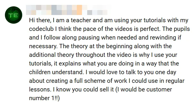 Hi there, I am a teacher and am using your tutorials with my code club I think the pace of the videos is perfect. The pupils and I follow along pausing when needed and rewinding if necessary. The theory at the beginning along with the additional theory throughout the video is why I use your tutorials, it explains what you are doing in a way that the children understand.