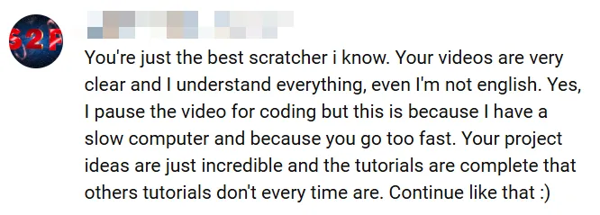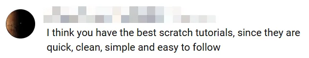 Your Scratch tutorials are unmatched. I think you've found a perfect balance between keeping the videos a certain length and making sure the viewer understands what they're doing. I usually watch the tutorials before following them so I have a general idea of what I'm going to have to do when I eventually follow them. Keep doing what you're doing, because you're doing an incredible job. :)